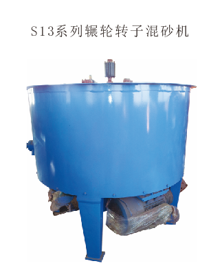 該系列混砂機工作機構由一個輾輪、一個混砂轉子和三個刮板組 成。既保留了輾輪的輾力和搓擦作用,使型砂具有較高的強度,又增 加了混砂轉子強烈的攪拌作用,使型砂強度上升快,混砂周期短,生 產率高,而且砂質松散,透氣性好。本品還采用了彈簧加壓和氣壓加 水等結構,對提高型砂質量和提高生產效率起了重要作用。